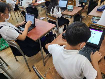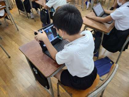 4年1組の体育の様子です。体育の授業で撮影した跳び箱運動の動画を、振り返りシートに入れていました。