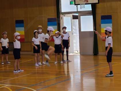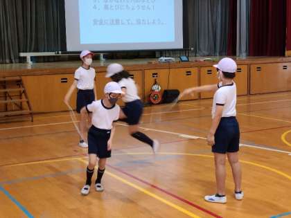 4年2組の体育の様子です。用具を操作する運動で、長なわを使って運動しています。「ハイ、ハイ」としっかり声をかけあって練習することができていました。