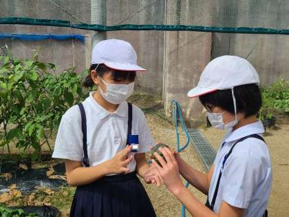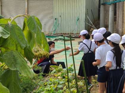 5年2組の理科の様子です。授粉したカボチャと受粉していないカボチャを観察しています。受粉したカボチャはしっかりと実ができました。