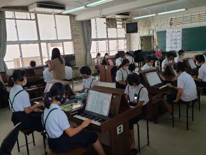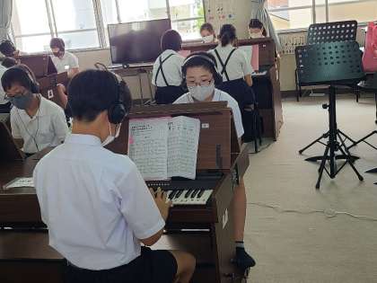 6年1組の音楽の様子です。「雨のうた」の演奏の練習をしています。音の響きを確かめながら何度も練習していました。