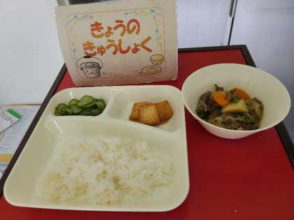 今日の給食は、肉じゃが、あつあげのみそだれかけ、あっさりきゅうり、ごはん、牛乳です。いただきます。