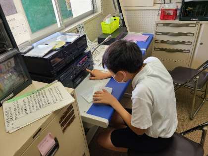 放送委員の児童がお昼の放送を流しています。今日は少し放送機器の調子が悪かったようです。一生懸命取り扱いについて確認してくれていました。