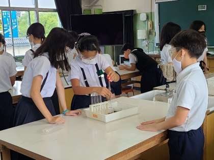 6年2組の理科の様子です。いろいろな水溶液を使い、その性質や金属を変化させる様子を調べ、水溶液の性質や働きについて学習します。
