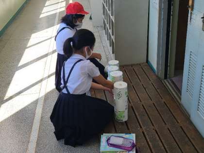 保健委員会の児童がトイレットペーパーの補充をしてくれています。図書館前でペーパーを持ち替えていました。