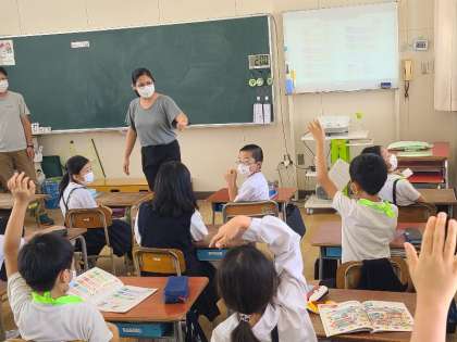3年2組の英語の様子です。食べ物や色など、何が好きかをたずねたり答えたりします。どのようにするか先生がお手本を見せています。