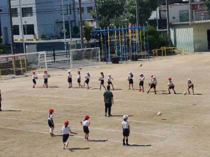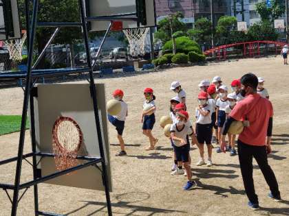 2年2組の体育のボールゲームの様子です。バスケットゴールを使って、投げる運動の練習もしっかりとしていました。