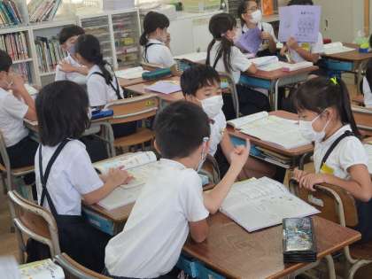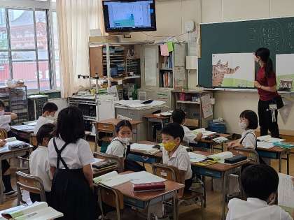 写真上:2年1組の国語の様子です。「ニャーゴ」を教材に、登場人物の行動や気持ちを想像し、発表していました。