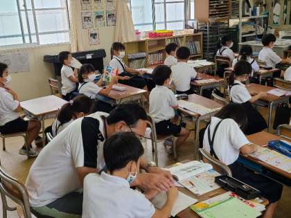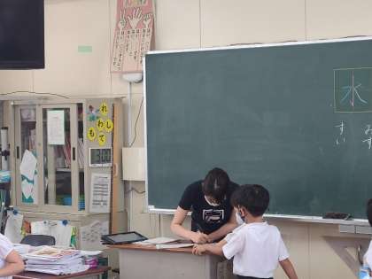 1年2組の国語の様子です。漢字の学習をしています。先生に点検してもらい、大きな二重丸をもらっていました。