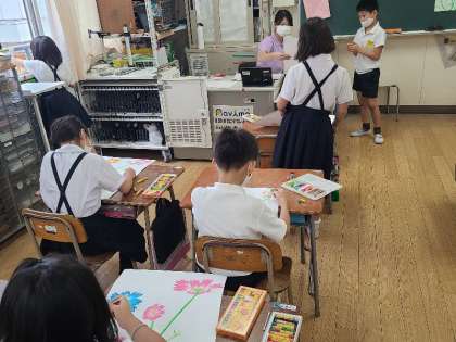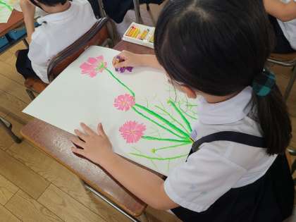 2年1組の図工の様子です。とても上手にコスモスを描きました。先生に作品を褒めてもらいました。