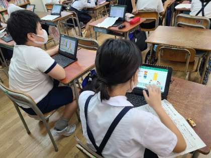 4年1組の様子です。昨年の新体力テストの数値をタブレットに入力して保存しています。