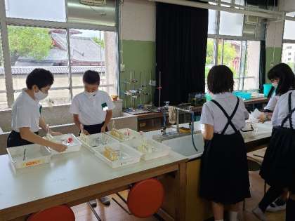 6年2組の理科の様子です。塩酸で金属を溶かしてできた固体は元の金属と同じか実験します。実験教材と安全めがねを取って実験スタートです。