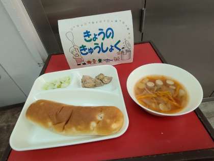 今日の給食は、鶏肉の香草焼き、ウインナーとてぼ豆のスープ、キャベツのガーリックソテー、パン、牛乳です。いただきます。