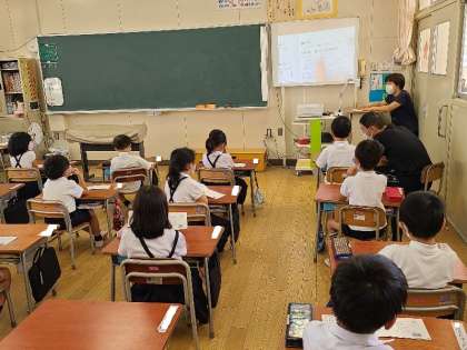1年1組の学活の様子です。遠足のしおりをプロジェクターに写して説明しています。