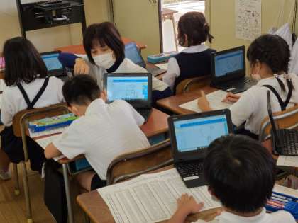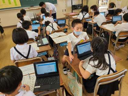 2年2組の国語の様子です。単元は「ことばで絵をつたえよう」です。相手にしっかりと伝わるように、順序や様子をあらわす言葉を考えています。