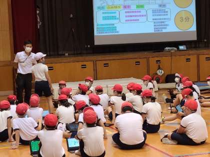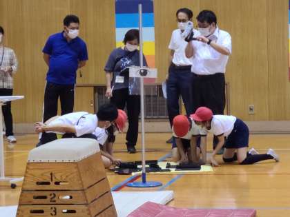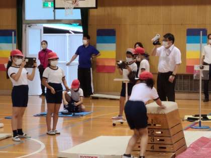 5時間目、4年1組で体育の授業研究を行いました。この授業研究もJAET全国大会の公開授業を兼ねています。単元は跳び箱運動の「台上前転」です。助走から腰の位置を高く保って着手し、前方に回転して着地できるように頑張ります。ICTを活用して、互いの課題を確認し、技ができるように友だちに伝え合います。