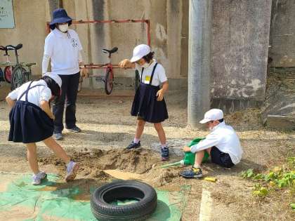 なかよしの様子です。「ビーバーの大工事」という水を使った学習です。「せき止める」や「ダム」の言葉の理解につながります。