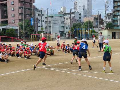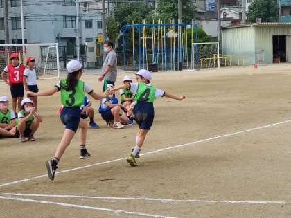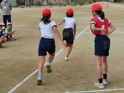 5年生の体育のリレーの様子です。バトンパスの様子です。前走者を確認して、「はい」「走って」の掛け声があると前を向いて全力で走り、減速せずにバトンパスをします。一生懸命練習していました。