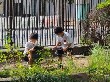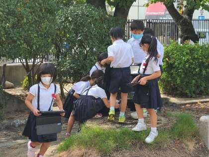 1年3組の国語の様子です。ウサギや虫などの生き物を撮影しています。写真をタブレットの発表ノートに貼り付け、生き物をテーマに一言日記として感想を書き込みます。