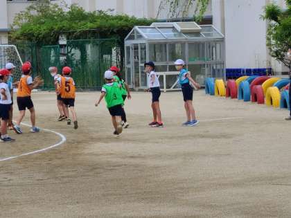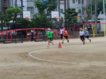 4年1組の体育のリレーの様子です。「頑張れ」の応援にみんな最後まで走り切りました。