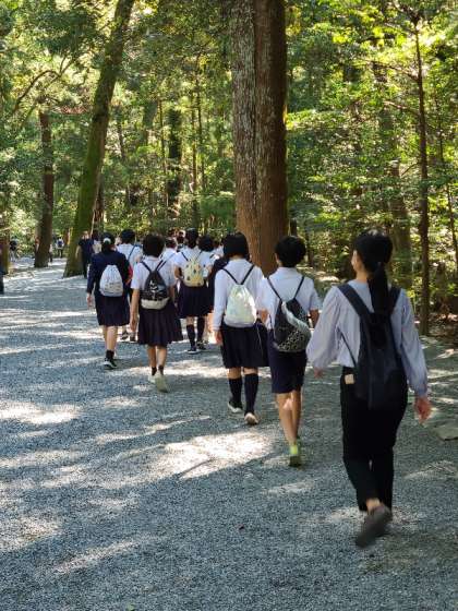 伊勢神宮の様子です。大きな木のある参道を歩きます。