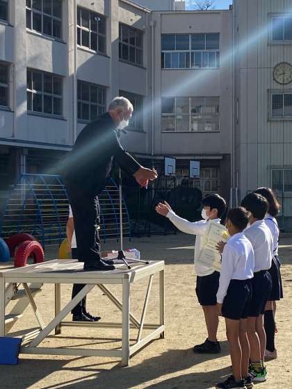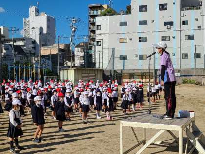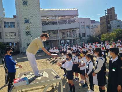 本日運動場で児童朝会を行いました。賞の伝達では、フットサル大会準優勝と天王寺小学校「こんな給食食べたいな!〜給食こんだてコンクール〜」の各賞の結果発表を行いました。最後に担当の先生から週目標についてお話がありました。今週の目標は「相手の気持ちを考えたことばづかいをしよう」です。