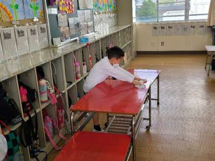 写真上:給食の配膳台を拭いています。しっかり役割を果たしています。