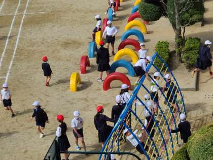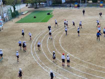 運動場の様子です。トラックのラインが引かれ、かけっこの練習をする児童もいました。