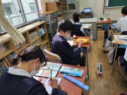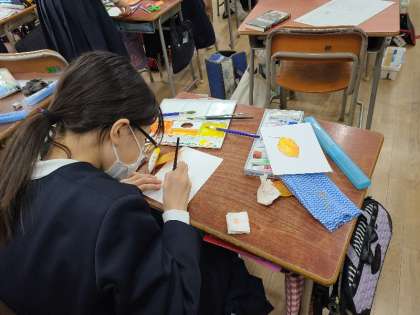 6年2組の図工の様子です。秋をテーマに絵を描いています。本物の落ち葉とまちがうほどうまく描いていました。