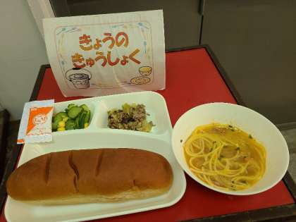 今日の給食は、牛肉のカレー風味焼き、ほたて貝とトマトのスープスパゲッティ、きゅうりとコーンのサラダ、パン、牛乳です。いただきます。
