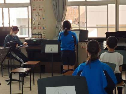 4年2組の音楽の様子です。リコーダーのテストをしています。廊下を伝わり、課題曲「オーラリー」のきれいな音色が職員室まで聞こえてきます。