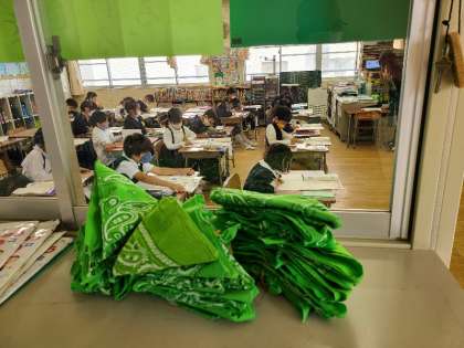 2年1組の下駄箱の上にあるバンダナです。運動会で使います。どんな使い方をするのか楽しみです。