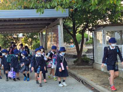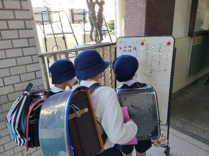 体育朝会のお知らせのボードを子どもたちが見ています。