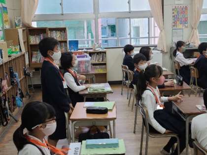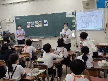5年1組の英語の様子です。写真を見てどこの国かを答えています。また、どこの国に行きたいか、その理由も含めて発表していました。