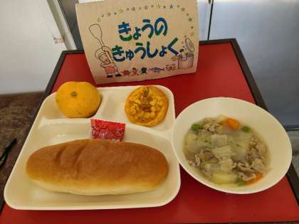 今日の給食は、豚肉と野菜のスープ煮、変わりピザ、みかん、パン、牛乳です。いただきます。