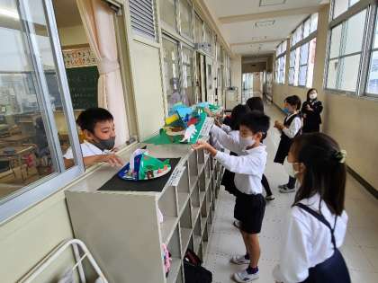 写真上:3年1組の図工の様子です。くるくるランドの作品の紹介をしました。