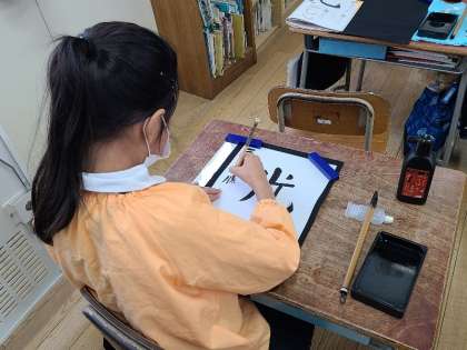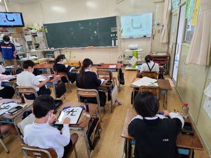 写真下:3年2組の書写の様子です。「曲がり」と「そり」を正しく丁寧に書いていました。