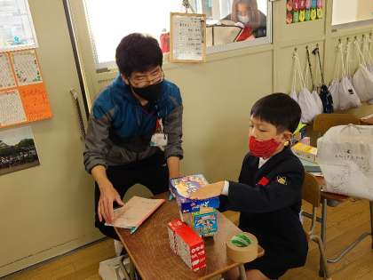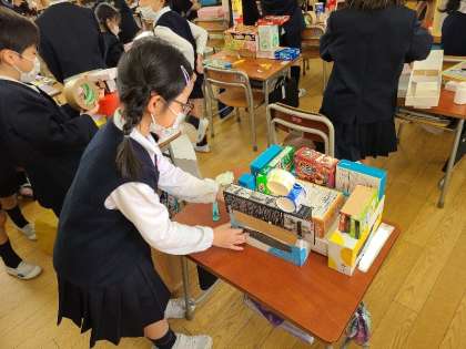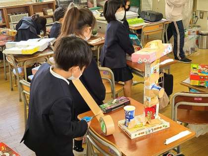 1年1組の図工の様子です。算数の時間に使った箱を活用して、建物や動物・乗り物などを作ります。ガムテープやはさみなどを上手く使っていました。