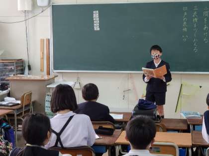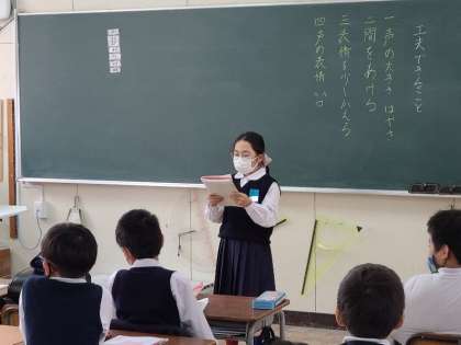 4年2組の国語の様子です。作文を発表しています。声の大きさや間をあけるなど、工夫できる点を決めて発表していました。