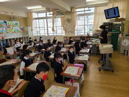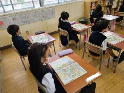 1年1組のせいかつかの様子。今日のどんぐり拾いは延期になりました。町の中で活動する時に注意しなければならないことなどを学習していました。