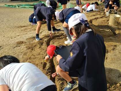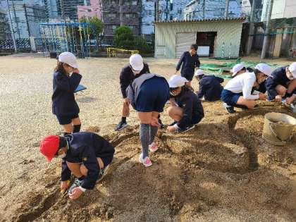 5年2組の理科の様子です。「流れる水のはたらき」を学習します。実験のため協力して作業をしていました。