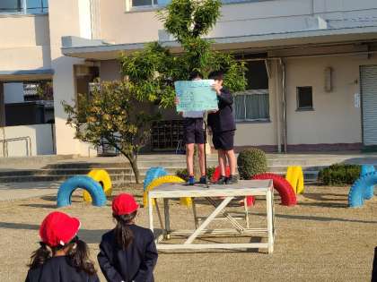 本日児童朝会を行いました。図書委員の児童から、読書週間や辞書引き大会等についてお話がありました。最後に担当から週目標についてお話がありました。今週の目標は、「姿勢を正しくしよう」です。