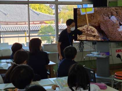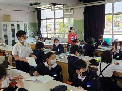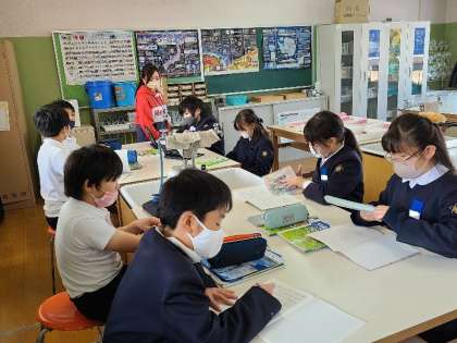 5年2組の理科の様子です。土山で行った実験結果から、「流れる水には、どんなはたらきがあるのだろうか」を考察しました。溝を流れる水の速さや土の様子をまとめ発表していました。