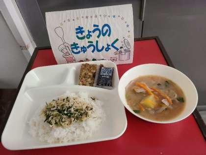 今日の給食は、お好み焼き、豚汁、とりなっ葉いため、ごはん、牛乳です。いただきます。