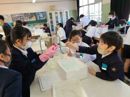 4年1組の理科の様子です。「空気をあたためたり、冷やしたりすると、体積はどうなるだろうか。」を実験しました。空気の入ったフラスコにゼリーの入ったガラス管つきのゴム栓をはめて、フラスコをあたためたり冷やしたりしてゼリーの位置の変化を見ます。