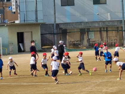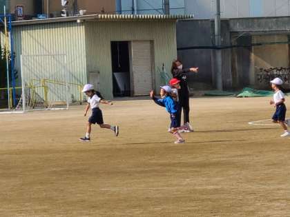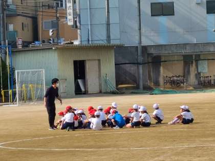 1年3組の体育の様子です。ボールゲームの前に鬼ごっこで体をほぐします。