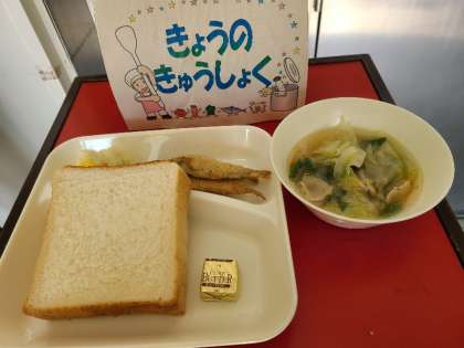 今日の給食は、わかさぎフライ、スープ、カリフラワーとコーンのサラダ、パン、牛乳です。いただきます。