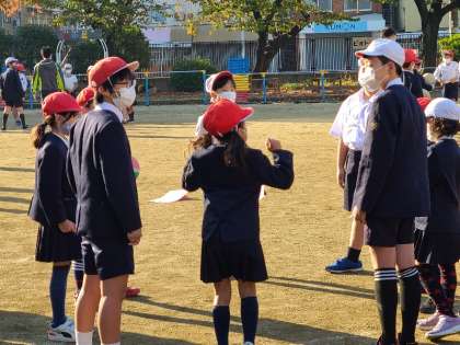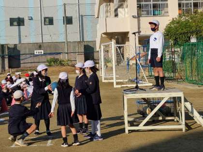 今日は児童集会を運動場で行いました。整列や集会で行うゲームの説明など、子どもたちが進行します。