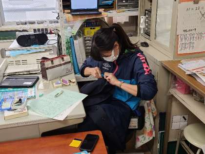 担任の先生がはずれてしまった児童の名札をつけてあげていました。
