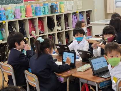 2年2組のせいかつかの様子です。町たんけんのまとめをしていました。写真を張り付けたり、発表する内容を書き込んでいました。