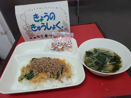 今日の給食は、ビビンバ、わかめスープ、アーモンドフィッシュ、牛乳です。いただきます。